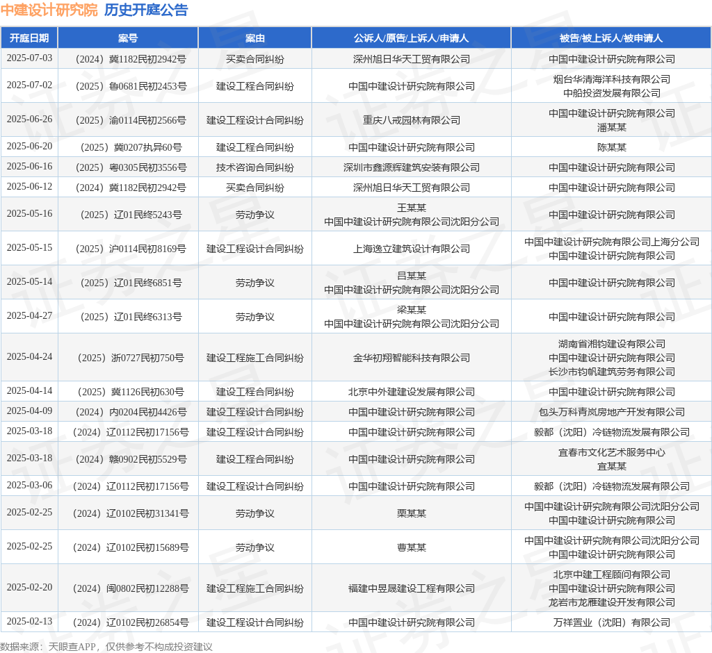 案号:(2025)冀0207执异60号审理法院:唐山市丰南区人民法院案由:建设工程合同纠纷当事人信息: 原告/上诉人:中国中建设计研究院有限公司 被告/被上诉人:陈某某开庭日期:2025年6月20日根据统计,近一年内以中国中建设计研究院有限公司为当事人的历史开庭公告有46则,其中案由为“建设工程设计合同纠纷”的公告以15则居首,其次为“劳动争议”有12则,“建设工程合同纠纷”有6则。历史开庭公告(前20条)如下: