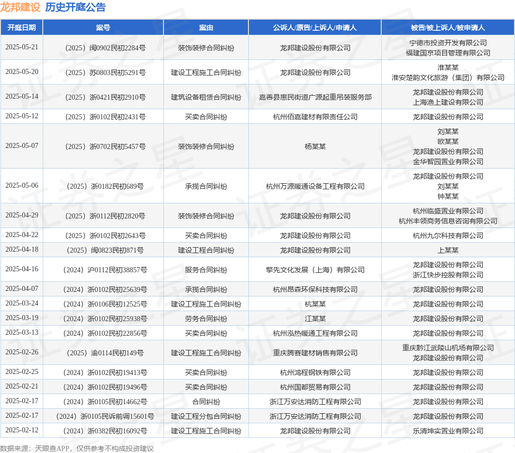 本站消息久联优配,根据天眼查APP显示,近日公布了一则龙邦建设股份有限公司作为被告/被上诉人的开庭公告,详细内容如下: