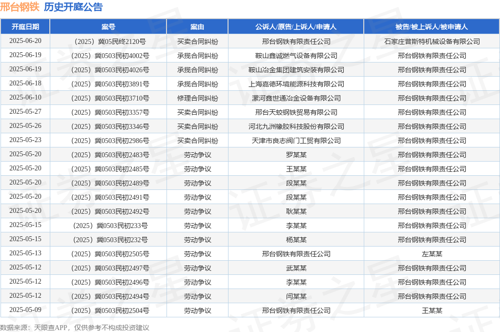 案号:(2025)冀05民终2120号审理法院:河北省邢台市中级人民法院案由:买卖合同纠纷当事人信息: 原告/上诉人:邢台钢铁有限责任公司 被告/被上诉人:石家庄普斯特机械设备有限公司开庭日期:2025年6月20日根据统计,近一年内以邢台钢铁有限责任公司为当事人的历史开庭公告有73则,其中案由为“劳动争议”的公告以39则居首,其次为“买卖合同纠纷”有21则,“承揽合同纠纷”有6则。历史开庭公告(前20条)如下: